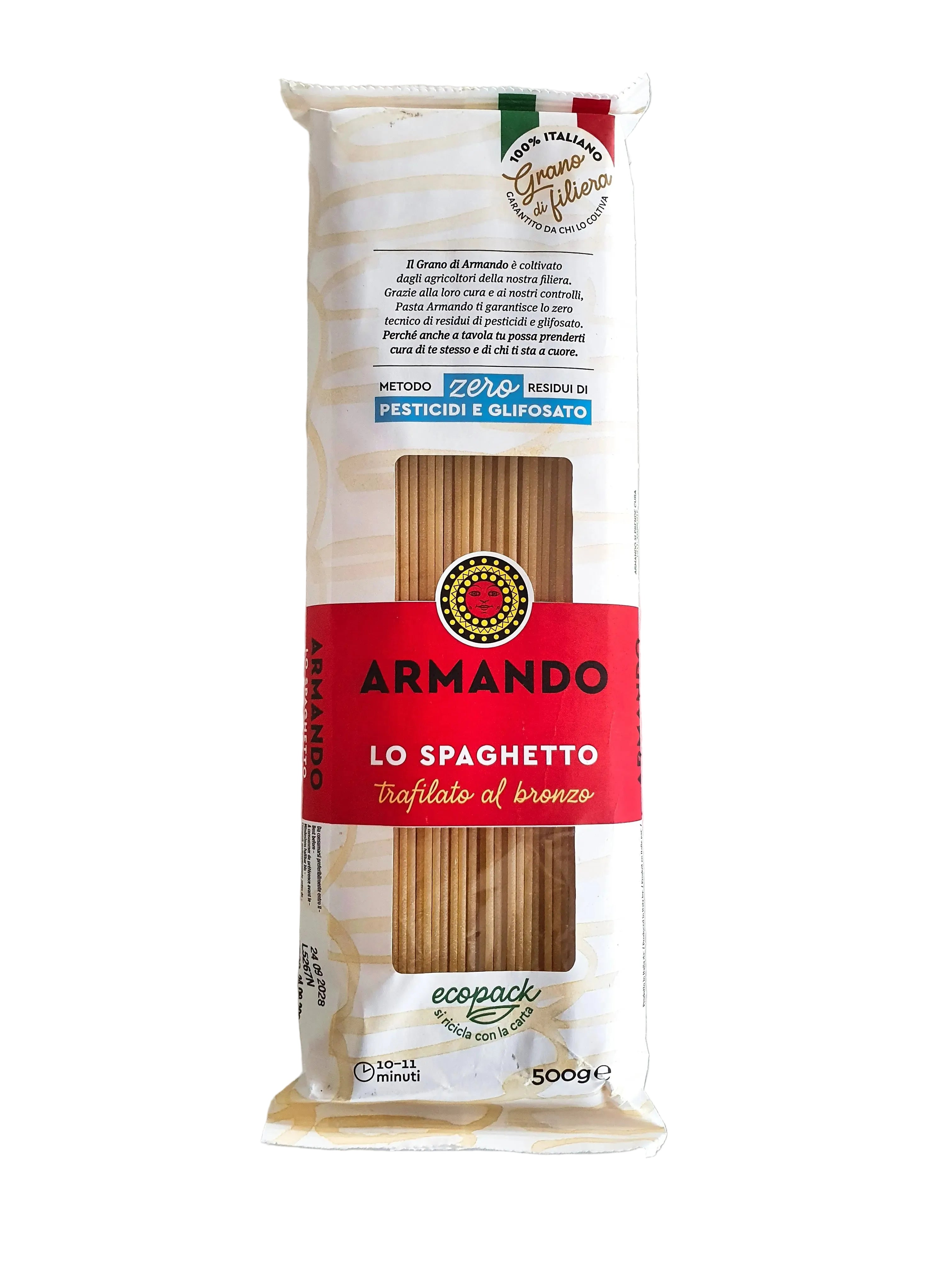 Makaronai Armando Lo Spaghetto (500 g), tai aukštos kokybės itališki spagečiai, gaminami iš 100% kietųjų kviečių (durum). Šie makaronai pasižymi tvirta tekstūra, puikiai išlaiko reikiamą konsistenciją ir idealiai dera su įvairiais itališkais padažais – nuo paprasto pomidorų iki sodrių mėsos ar jūros gėrybių.