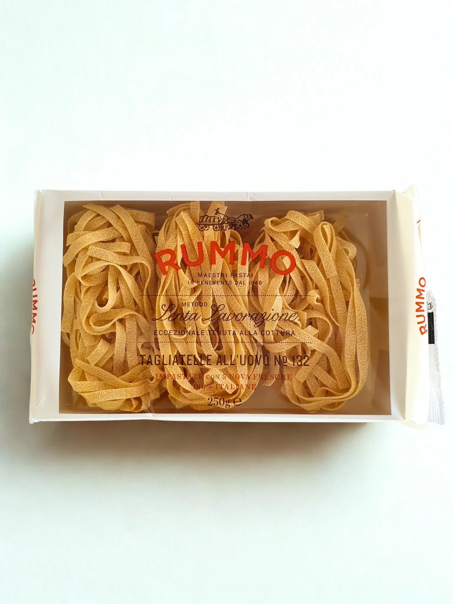 Makaronai Rummo Tagliatelle all'Uovo (250 g), tai aukštos kokybės itališki kiaušininiai makaronai. Pasižymi švelnia tekstūra, sodriu skoniu ir puikiai sugeria padažus, todėl idealiai tinka klasikiniams itališkiems patiekalams su mėsos, grietinėlės ar daržovių padažais.