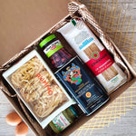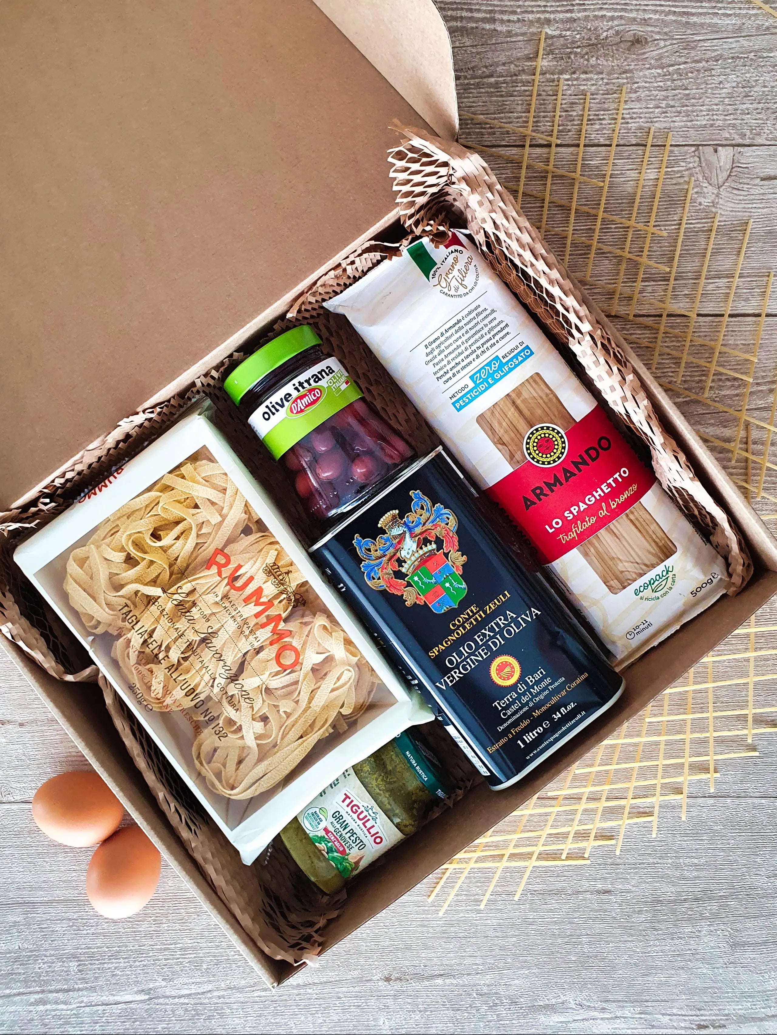 „Itališko skonio dėžutė" – tai atrinktų produktų rinkinys tikram itališkos virtuvės mėgėjui. Dėžutėje rasite aukštos kokybės alyvuogių aliejų, Rummo kiaušininius tagliatelle makaronus, Armando spagečius, pesto padažą ir aromatingas juodąsias alyvuoges – viską, ko reikia autentiškam itališkam patiekalui namuose.