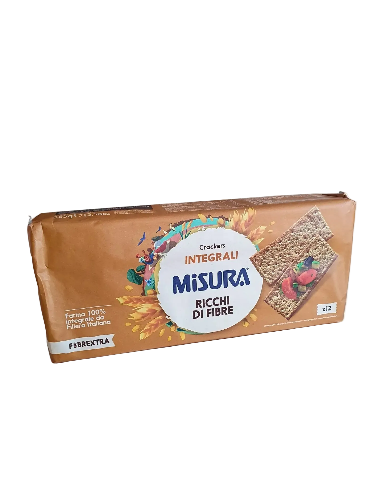 Viso grūdo krekeriai su skaidulomis (385 g). Tinka kaip pagrindas įvairiems sveikiems ir skaniems užkandžiams.
