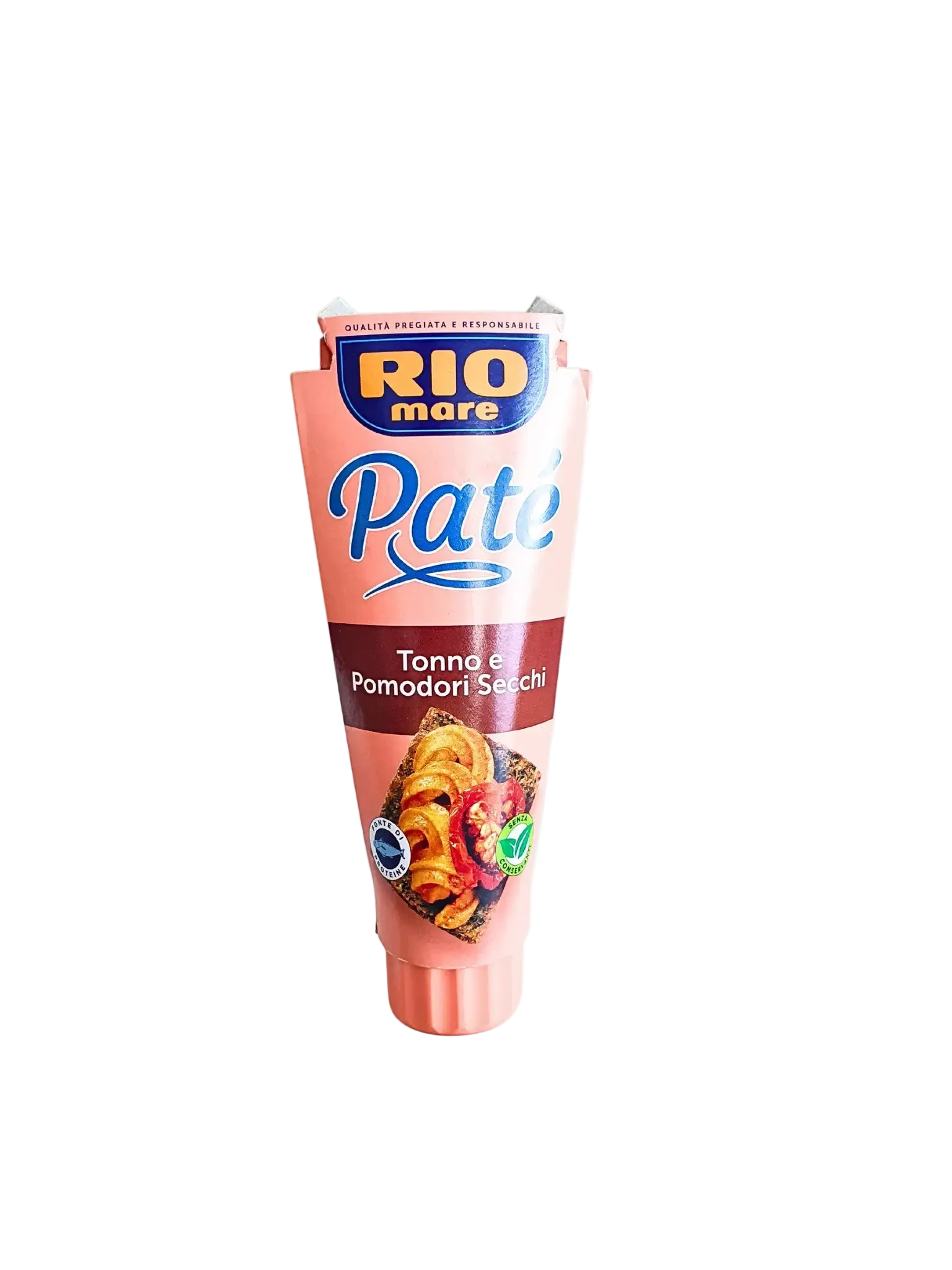 Tuno ir pomidorų paštetas Rio Mare Pate Tonno e Pomodori Secchi (100 g). Paštetas puikiai tinka užtepti ant duonos, sustiprinti žalių ar gamintų daržovių skonį ar jas papuošti. Pamėginkite šiuo paštetu įdaryti pomidorus, ar kiaušinius – šis derinys jūsų tikrai nenuvils.
